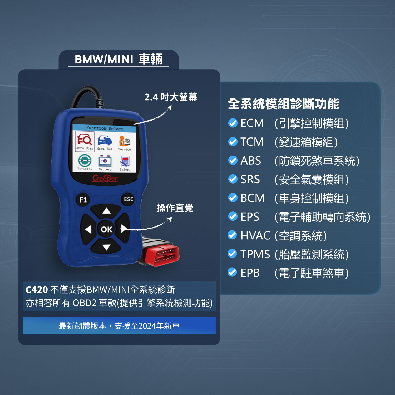 ⦿ BMW/MINI 全模組掃描:ECM、TCM、ABS、SRS、EPB、TPMS… 一次掌握所有電子系統健康狀況。